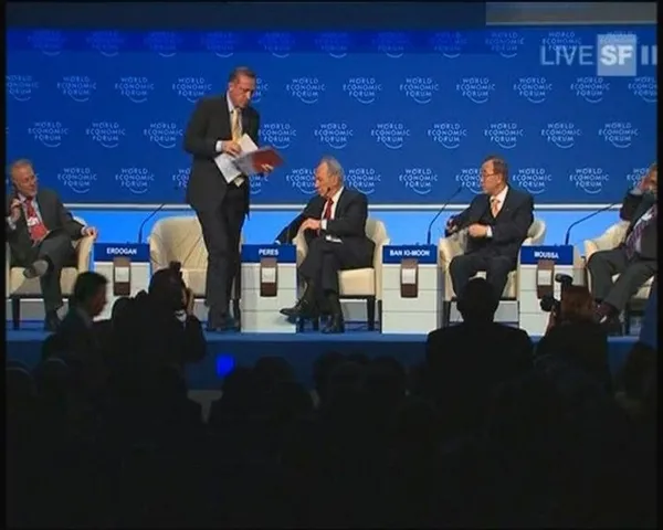 Başkan Erdoğan'ın, "Sadece size, iki söz söyleyeceğim..." sözleri üzerine, oturum yöneticisi, araya girdi. Erdoğan, "sözümü kesmeyin" diyerek, "Tevrat'ın 6. maddesi der ki 'Öldürmeyeceksin. Burada öldürme var" diyerek sözlerini sürdürdü. Sonra oturum yöneticisine dönen Erdoğan, "Sana da çok teşekkür ediyorum. Benim için de bundan böyle Davos bitmiştir. Daha Davos'a gelmem. Siz konuşturmuyorsunuz. 25 dakika konuştu, 12 dakika konuştum, olmaz" diyerek salonu terketti.