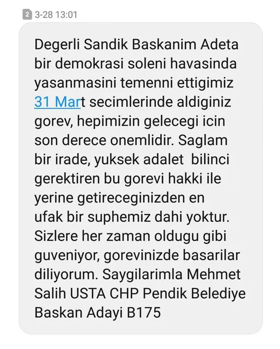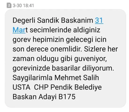 CHP Pendik Belediye Başkan adayı Salih Usta'nın, 30 Mart 2019 tarihinde saat 18.41'de sandık kurulu başkanına gönderdiği mesajda; "Değerli sandık başkanım. 31 Mart seçimlerinde aldığınız görev hepimizin geleceği için çok önemlidir. Sizlere her zaman olduğu gibi güveniyor, görevinizde başarılar diliyorum. CHP Pendik Belediye Başkan adayı Salih Usta" ifadeleri yer alıyor.