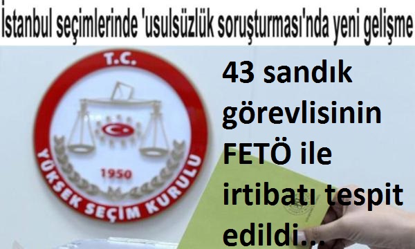 İstanbul seçimlerinde usulsüzlük iddialarında çarpıcı bir bilgi daha geldi. Soruşturma kapsamında edinilen son dakika bilgisine göre 43 şüphelinin FETÖ ile irtibatı tespit edildi