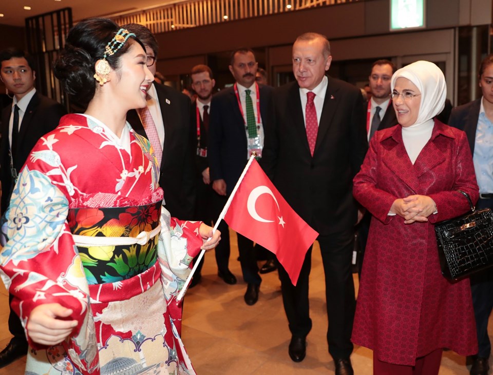 Cumhurbaşkanı Recep Tayyip Erdoğan, G20 Liderler Zirvesi'ne katılmak üzere özel uçak Japonya'ya gitti. Cumhurbaşkanı Erdoğan ve eşi Emine Erdoğan'ı 2020 Olimpiyatları için Türkiye'ye özel tasarlanan kimonolu bir kadın karşıladı. Kimononun üstünde Galata Kulesi, Sultanahmet Camii, peri bacaları, Ertuğrul Firkateyni ve lale motifleri vardı.