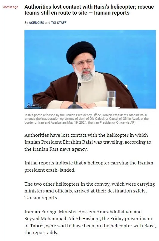 Reisi'nin helikopterinin İsrail tarafından sabotaja uğradığına dair şüpheler devam ederken İsrail gazetesi Times of Israel'den ilk haber geldi. Reisi'nin uçağının düştüğünü yazan The Times of Israel, konvoyda bakanları taşıyan diğer helikopterlerin varış noktasına ulaştığını iddia etti.
