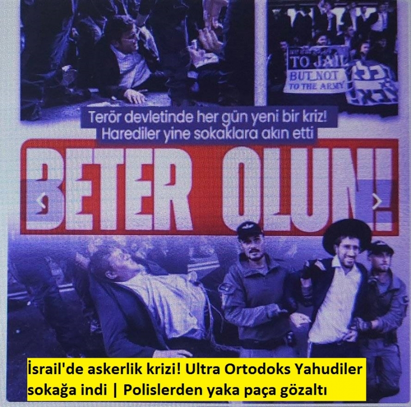 İşgalci İsrail'de son günlerde zorunlu askerlik krizi sürüyor. Son olarak Ultra Ortodoks Yahudiler (Harediler), Bney Brak kentinde İsrail'deki zorunlu askerlik hizmetini protesto etti. Göstericiler, kuzey-güney yönünde uzanan ve Bney Brak kentinden geçen 4 numaralı otoyolu trafiğe kapattı. Polisler, otoyolda oturma eylemi yapan göstericileri dağıtmak için zaman zaman müdahalede bulundu. Birbirlerine kenetlenen ve polise direnen göstericiler uzun bir süre trafiğin akışına engel oldu. Göstericileri ayırarak trafiği açmaya çalışan polisin, göstericilerden bazılarını yerde sürüklediği anlar kameralara böyle yansıdı.