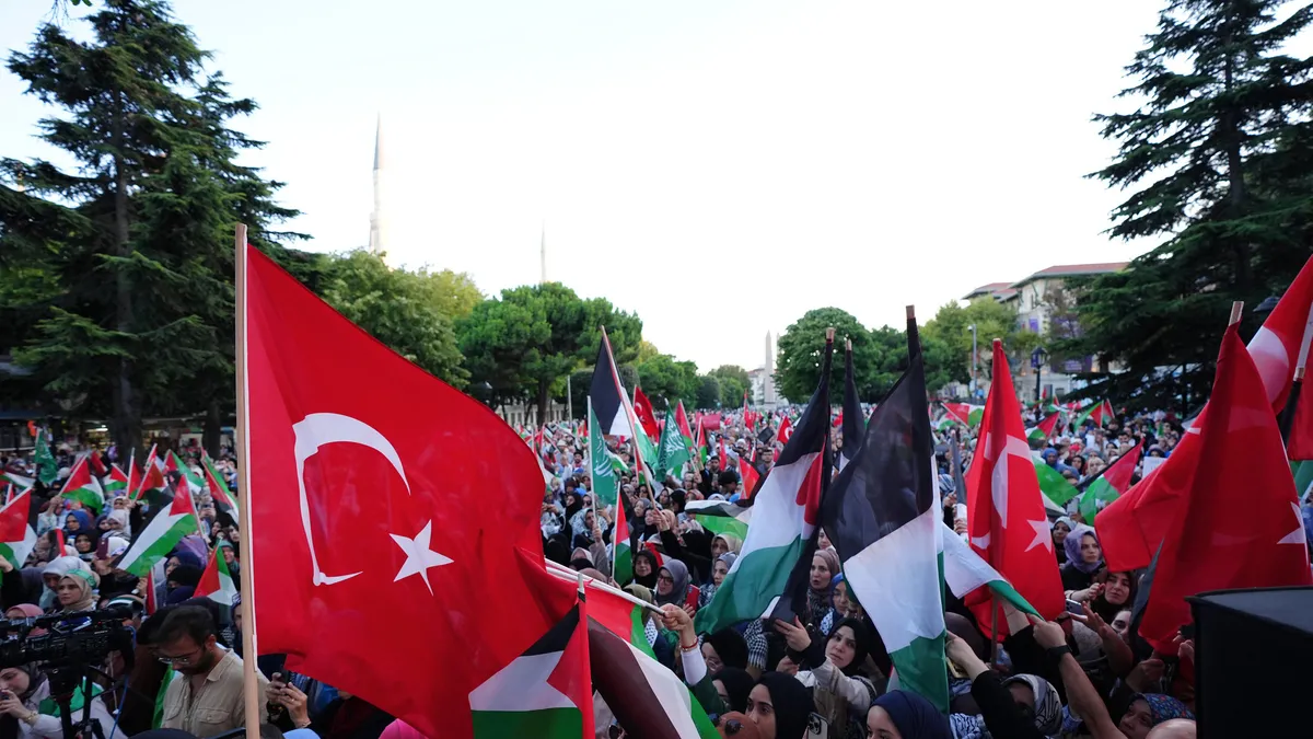 Vatandaşlar Türk ve Filistin bayrakları ile Kelime-i Tevhid flaması ve kefiye taşıdı, Filistin'in özgürlüğü için haykırdı.