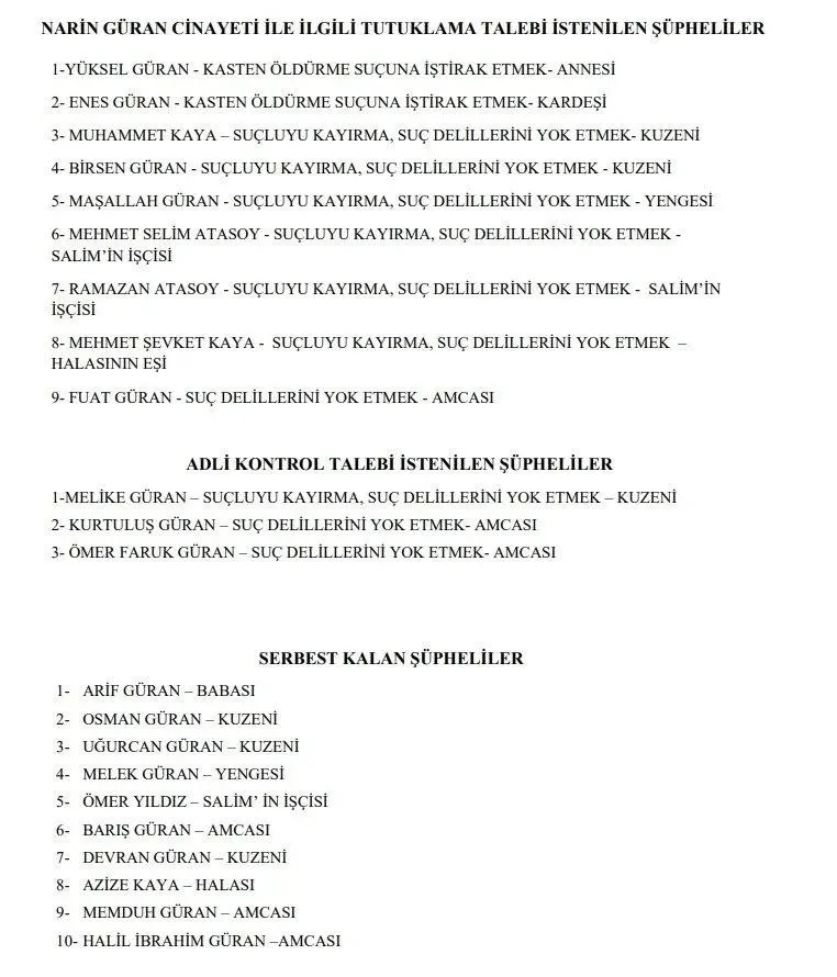 Diyarbakır'daki Narin Güran cinayetine ilişkin soruşturmada 13 kişi serbest bırakıldı, 9 kişi hakkında tutuklama talep edildi. 8 yaşındaki Narin'in annesi Yüksel Güran ve ağabey Enes Güran da 'tutuklama' istenen isimler arasında. Anne ve ağabeye yöneltilen suçlama "kasten öldürme suçuna iştirak." Tutuklama listesinde Narin'in amcası, 2 kuzeni, 1 akrabası ve baş şüpheli