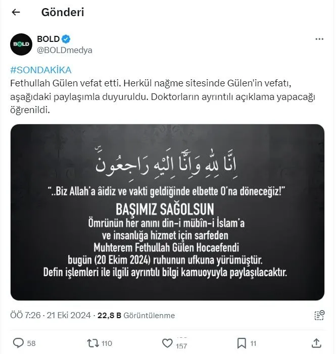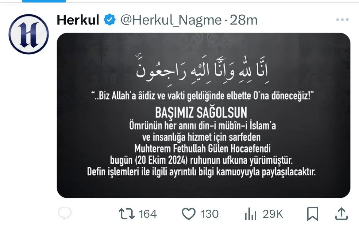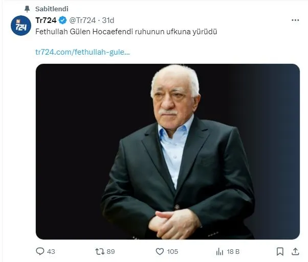 Tr724 isimli haşhaşi X hesabı ise "Fetullah Gülen Hocaefendi ruhunun ufkuna yürüdü" başlığıyla iblis başının geberdiğini ilan etti.