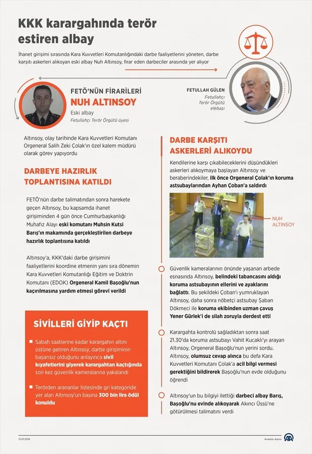 FETÖ'nün 15 Temmuz ihanet girişiminde aktif rol oynayan, sivillerin şehit düşmesine ve yaralanmasına neden olan darbecilerden bazıları, başarısız olduklarını anlayınca kaçtı. İhanet girişimi sırasında Kara Kuvvetleri Komutanlığındaki darbe faaliyetlerini yöneten, darbe karşıtı askerleri alıkoyan eski albay Nuh Altınsoy ve Deniz Kuvvetleri Komutanı'nı kaçırmaya çalışan eski istihbarat kurmay albay Mahmut Arduç firar eden darbeciler arasında yer alıyor.