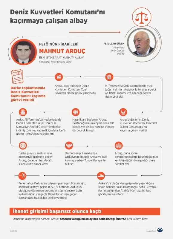Darbe girişiminden bir gün önce Deniz Kuvvetleri Komutanlığı karargahında eski tuğamiral İrfan Arabacı ile bir araya gelen Arduç, ihanet akşamı icra edeceği göreve ilişkin bilgi aldı.