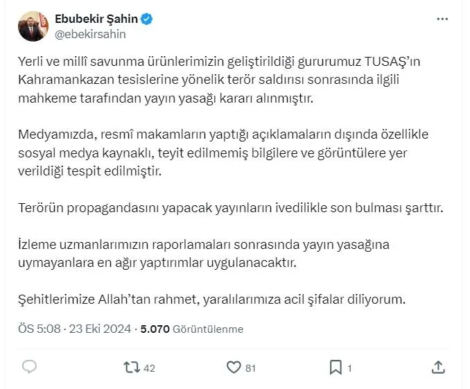 RTÜK Başkanı Ebubekir Şahin, "Terörün propagandasını yapacak yayınların ivedilikle son bulması şarttır" deyip saldırıya ilişkin yayın yasağı geldiğini duyurdu.