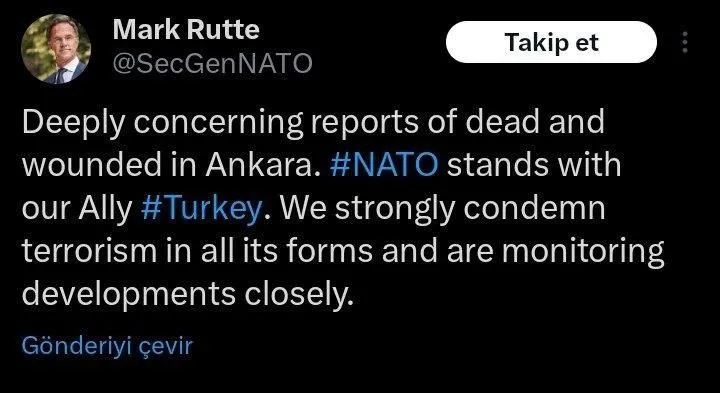 NATO Genel Sekreteri Mark Rutte, TUSAŞ’a düzenlenen terör saldırısını kınadı.