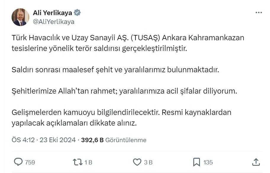 Bakan Yerlikaya, "Türk Havacılık ve Uzay Sanayii AŞ. (TUSAŞ) Ankara Kahramankazan tesislerine yönelik terör saldırısı gerçekleştirilmiştir. Saldırı sonrası maalesef şehit ve yaralılarımız bulunmaktadır. Şehitlerimize Allah'tan rahmet; yaralılarımıza acil şifalar diliyorum. Gelişmelerden kamuoyu bilgilendirilecektir. Resmi kaynaklardan yapılacak açıklamaları dikkate alınız" ifadelerini kullandı.