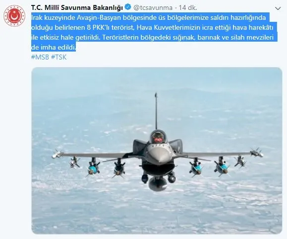 "Irak kuzeyinde Avaşin-Basyan bölgesinde üs bölgelerimize saldırı hazırlığında olduğu belirlenen 8 PKK'lı terörist, Hava Kuvvetlerimizin icra ettiği hava harekâtı ile etkisiz hale getirildi. Teröristlerin bölgedeki sığınak, barınak ve silah mevzileri de imha edildi."