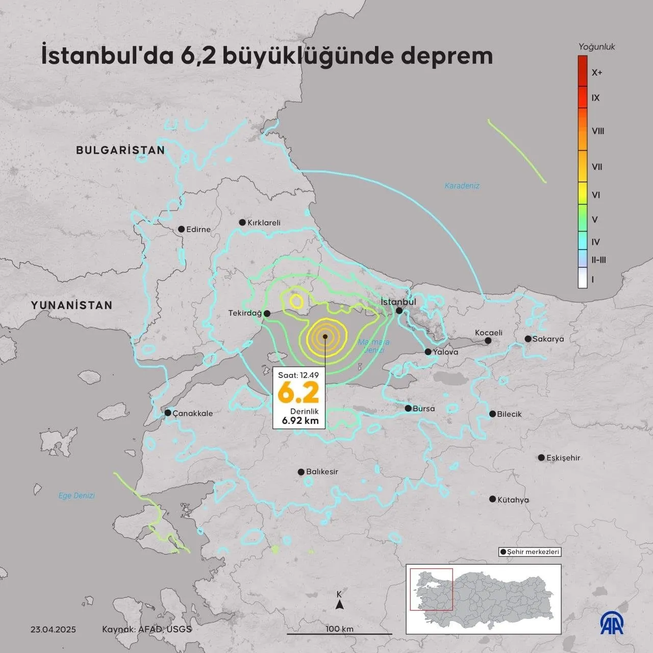 İstanbul'da saat 12.49'da 6,2 büyüklüğünde bir deprem meydana geldi.