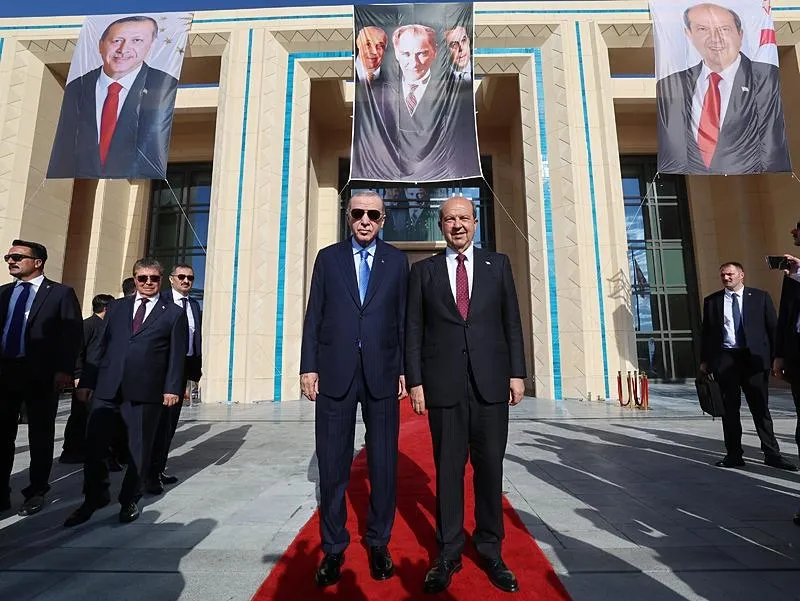 Başkan Recep Tayyip Erdoğan, 9 aylık aranın ardından bugün Kuzey Kıbrıs Türk Cumhuriyeti'ne gitti. Lefkoşa'da KKTC Cumhurbaşkanı Ersin Tatar ile görüşen Başkan Erdoğan, yeni Cumhurbaşkanlığı ve Cumhuriyet Meclisi yerleşkesinin açılışını gerçekleştirdi. Erdoğan, "Burası Kıbrıs Türk halkının kararlılığının sembolüdür" ifadelerini kullandı. Erdoğan her zaman Kıbrıs Türk halkının yanında olmaya devam edeceklerini belirtti.