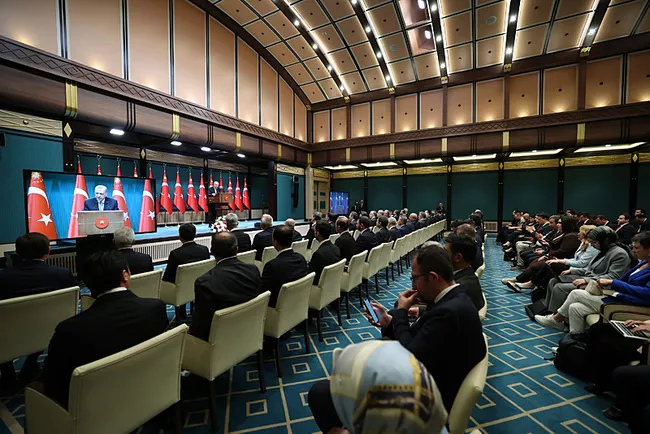 Başkan Recep Tayyip Erdoğan liderliğinde Cumhurbaşkanlığı Külliyesi'ndeki saat 16.45'te başlayan ve yaklaşık 1,5 saat süren Kabine Toplantısı sona erdi. Başkan Erdoğan kritik toplantı sonrası açıklamalarda bulundu. Türkiye'nin pusulasının aydınlık ve müreffeh ufukları gösterdiğini ifade eden Erdoğan, "Küresel siyaset ve ekonominin fırtınalı döneminde Türkiye'nin kaptan köşkü liyakatli, tecrübeli ve dirayetli kadrolara emanettir, emin ve ehil ellerdedir." dedi. PKK'nın fesih kararını ilişkin konuşan Başkan Erdoğan, "Her alanda yeni bir dönemin kapıları açılacaktır. Emperyalistlerin asırlık planları ölümcül bir darbe yiyecek, kardeşliğimize saplanan kanlı hançer sökülüp atılacaktır. Ocaklara ateşlerin düştüğü günler geri kalmıştır." ifadelerini kullandı.