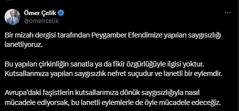 AK Parti Genel Başkan Yardımcısı ve Parti Sözcüsü Ömer Çelik, "Bir mizah dergisi tarafından Peygamber Efendimize yapılan saygısızlığı lanetliyoruz. Bu yapılan çirkinliğin sanatla ya da fikir özgürlüğüyle ilgisi yoktur." ifadelerini kullandı.