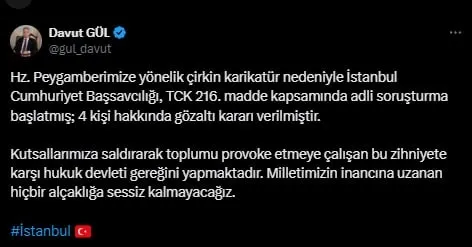 İstanbul Valisi Davut Gül de X hesabından yaptığı açıklamada başsavcılığın 4 kişi hakkında gözaltı kararı verdiğini duyurdu. Vali Gül, "Hz. Peygamberimize yönelik çirkin karikatür nedeniyle İstanbul Cumhuriyet Başsavcılığı, TCK 216. madde kapsamında adli soruşturma başlatmış; 4 kişi hakkında gözaltı kararı verilmiştir.