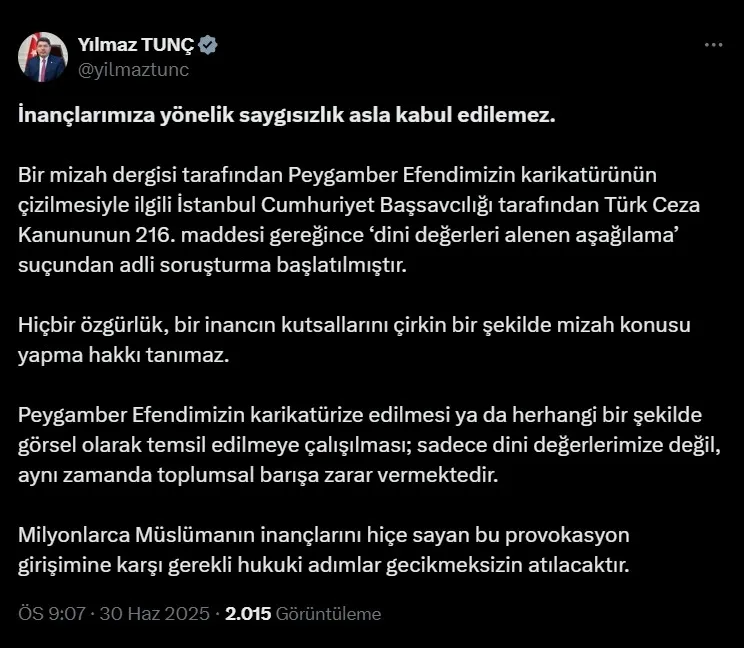 Kutsallarımıza saldırarak toplumu provoke etmeye çalışan bu zihniyete karşı hukuk devleti gereğini yapmaktadır. Milletimizin inancına uzanan hiçbir alçaklığa sessiz kalmayacağız." ifadelerini kullandı.