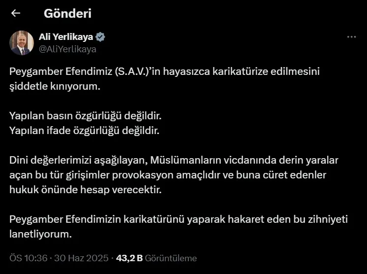 İçişleri Bakanı Ali Yerlikaya, bir mizah dergisinde Hazreti Muhammed'in karikatürünün yayınlanmasını kınadı.