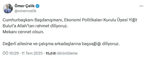 AK Parti Sözcüsü Ömer Çelik, "Cumhurbaşkanı Başdanışmanı, Ekonomi Politikaları Kurulu Üyesi Yiğit Bulut'a Allah'tan rahmet diliyoruz. Mekanı cennet olsun. Değerli ailesine ve çalışma arkadaşlarına başsağlığı diliyoruz." dedi.