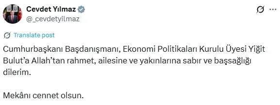 "Cumhurbaşkanı Başdanışmanı, Ekonomi Politikaları Kurulu Üyesi Yiğit Bulut’a Allah’tan rahmet, ailesine ve yakınlarına sabır ve başsağlığı dilerim. Mekânı cennet olsun."