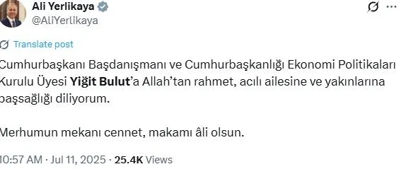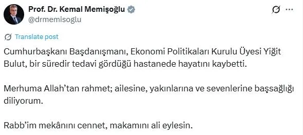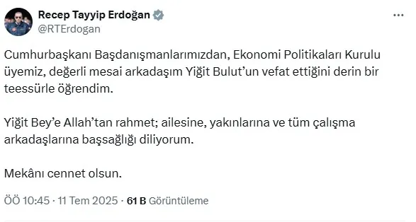 "Cumhurbaşkanı Başdanışmanı ve Cumhurbaşkanlığı Ekonomi Politikaları Kurulu Üyesi Yiğit Bulut’a Allah’tan rahmet, acılı ailesine ve yakınlarına başsağlığı diliyorum. Merhumun mekanı cennet, makamı âli olsun."