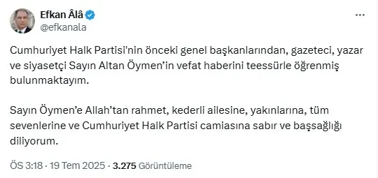 AK Parti Genel Başkanvekili Efkan Ala, Öymen'in vefatının ardından yaptığı paylaşımda, "Cumhuriyet Halk Partisi'nin önceki genel başkanlarından, gazeteci, yazar ve siyasetçi Sayın Altan Öymen’in vefat haberini teessürle öğrenmiş bulunmaktayım. Sayın Öymen’e Allah’tan rahmet, kederli ailesine, yakınlarına, tüm sevenlerine ve Cumhuriyet Halk Partisi camiasına sabır ve başsağlığı diliyorum." ifadelerine yer verdi.