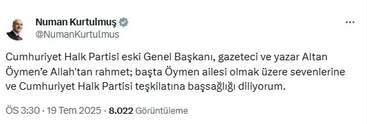 TBMM Başkanı Numan Kurtulmuş, "Cumhuriyet Halk Partisi eski Genel Başkanı, gazeteci ve yazar Altan Öymen’e Allah'tan rahmet; başta Öymen ailesi olmak üzere sevenlerine ve Cumhuriyet Halk Partisi teşkilatına başsağlığı diliyorum." dedi.
