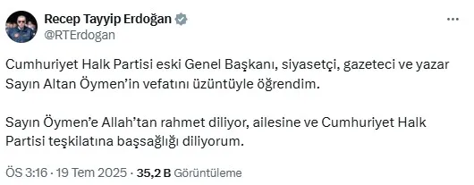 Erdoğan, "Cumhuriyet Halk Partisi eski Genel Başkanı, siyasetçi, gazeteci ve yazar Sayın Altan Öymen'in vefatını üzüntüyle öğrendim. Sayın Öymen'e Allah'tan rahmet diliyor, ailesine ve Cumhuriyet Halk Partisi teşkilatına başsağlığı diliyorum." dedi.