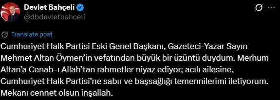 "Cumhuriyet Halk Partisi eski Genel Başkanı, gazeteci-yazar Sayın Mehmet Altan Öymen'in vefatından büyük bir üzüntü duydum. Merhum Altan'a Cenabıallah'tan rahmetler niyaz ediyor, acılı ailesine, Cumhuriyet Halk Partisi'ne sabır ve başsağlığı temennilerimi iletiyorum. Mekanı cennet olsun inşallah."
