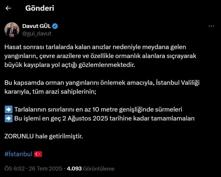 Bu kapsamda orman yangınlarını önlemek amacıyla, İstanbul Valiliği kararıyla, tüm arazi sahiplerinin;