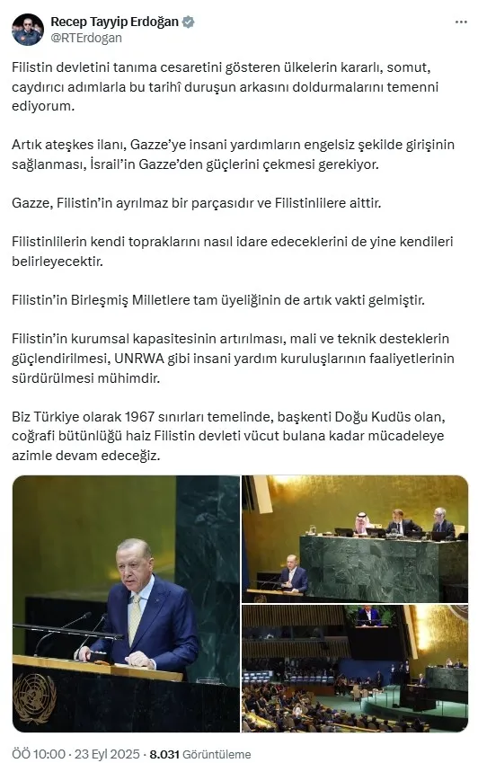 Başkan Erdoğan, "Konuşmamın hemen başında, Filistin'in giderek artan sayıda ülke tarafından tanındığı bir dönemde, Filistin Devlet Başkanı Sayın Mahmut Abbas'ın bugün bizzat aramızda olamayışından duyduğum üzüntüyü ifade etmek istiyorum. Biz bugün bu kürsüde kendi vatandaşlarımızla birlikte sesi kısılmak istenen Filistin halkının hissiyatına tercüman olmak için de bulunuyoruz. Filistin Devleti'ni tanıyacağını açıklayan tüm ülkelere teşekkür ediyor, henüz bu kararı almayan devletleri ise bir an önce harekete geçmeye çağırıyorum." diye konuştu. Birleşmiş Milletler Şartı'nın bundan 80 yıl önce San Francisco'da imzalandığını ve 24 Ekim 1945'te yürürlüğe girdiğini anımsatan Erdoğan, Birleşmiş Milletler Kuruluş Şartı'nın ilk maddesinin ilk kelimelerini burada tekrar hatırlatmak istediğini belirterek, şöyle devam etti: "'Birleşmiş Milletler'in amacı, uluslararası barış ve güvenliği korumaktır.' Evet, bizler bu salonda Birleşmiş Milletler'in 80'inci yaşını kutlarken dünyanın birçok bölgesinde Kuruluş Şartı'nın ilk maddesinin ilk kelimelerine gölge düşürecek vahim hadiseler yaşanıyor. Özellikle Gazze'de gözlerimizin önünde 700 günü aşkın bir süredir soykırım devam ediyor. Biz toplantı halindeyken dahi Gazze'de şu anda siviller katlediliyor. Gazze'de ölen sivillerin sayısı 65 bini geçti. Enkaz altında kaç cenazenin olduğu henüz bilinmiyor. Ölenlerin 20 binden fazlası çocuk. İsrail tarafından, Gazze'de son 23 aydır her saat bir çocuk acımasızca hayattan kopartılıyor. Bunlar sayı değil dostlar, hepsi birer can, birer masum insan. Şu anda sadece silahlarla değil, açlık silahıyla da insanlar öldürülüyor. 21'inci yüzyılda, medeni dünyanın bakışları altında, 146'sı çocuk 428 kişi açlıktan hayatını kaybetti ve sayı her geçen gün artıyor."