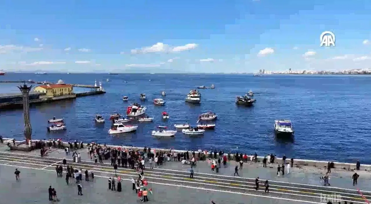 Filistin'e Destek Platformu tarafından organize edilen etkinlik kapsamında Bostanlı, Güzelbahçe, Sahilevleri, İnciraltı ve Mavişehir'deki balıkçı barınaklarından hareket eden tekneler Cumhuriyet Meydanı önünde buluştu.