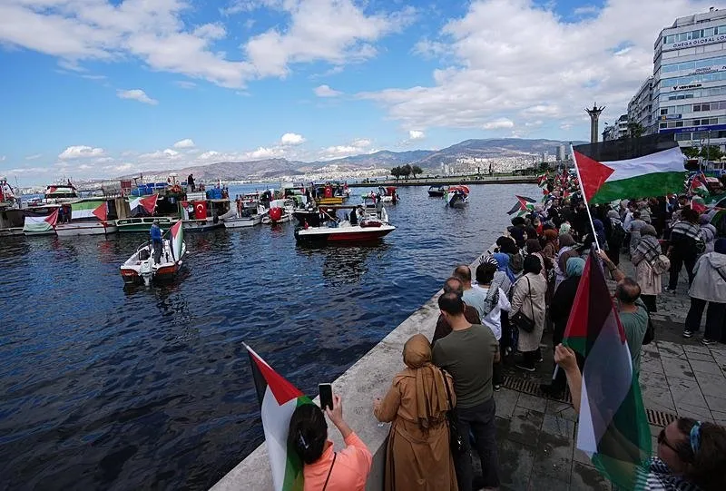 İzmir'de, Türk ve Filistin bayraklarıyla denize açılan tekneler Filistin ile Gazze'ye insani yardım ulaştırmak amacıyla yola çıkan ve İsrail'in saldırısına uğrayan Küresel Sumud Filosu'na destek verdi.
