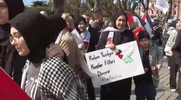 Ayasofya’da hareket eden kalabalık Eminönü Meydanı’na yürüyüş başladı. Yürüyüşte, “Gazze’deki soykırıma son”, “Filistin’e özgürlük” ve “Ablukayı kaldır” gibi sloganlarla Filistin halkıyla dayanışma mesajı veriliyor.