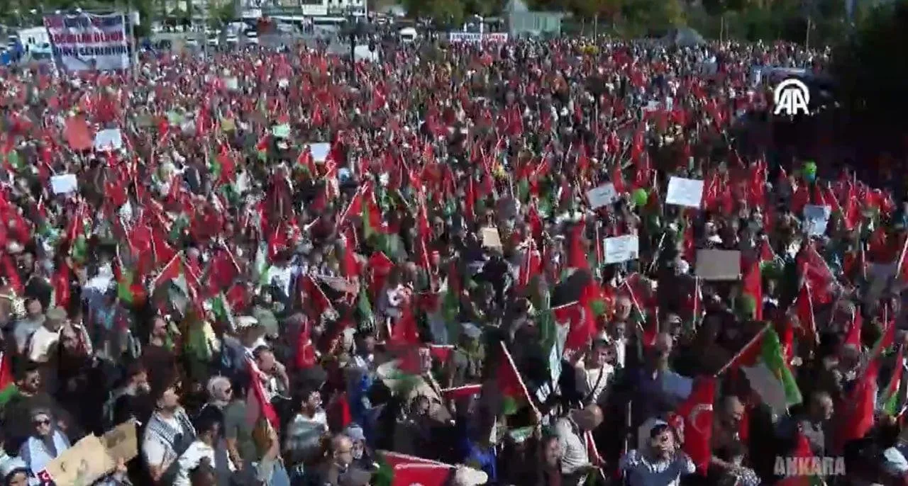 Ankara Filistin Dayanışma Platformuna (ANFİDAP) mensup sivil toplum kuruluşu üyeleri ile yaşlılar, gençler ve çocukların da aralarında olduğu binlerce kişi, Gazze'de yaşanan soykırıma dikkati çekmek ve İsrail'e tepkilerini yükseltmek için Melike Hatun Camisi önünde toplandı.