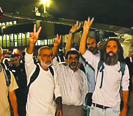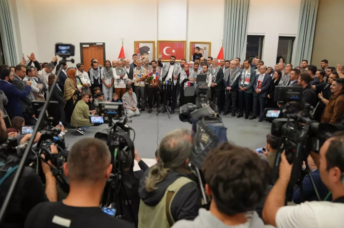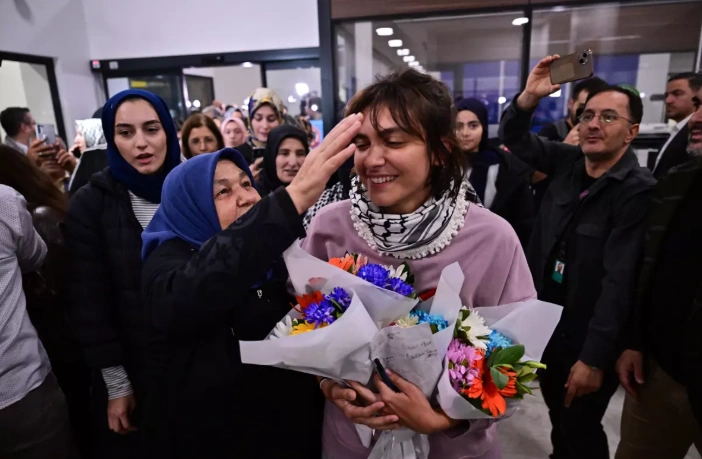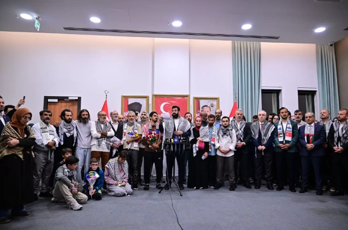 Haydut İsrail tarafından uluslararası sularda saldırıya uğrayıp alıkonulduktan sonra Türkiye'ye dönüşleri sağlanan Küresel Sumud Filosunda yer alan aktivistler Türkiye'ye döndü. Aktivistler havalimanında basın mensuplarına işgal ordusunun zalimliğini anlattı.