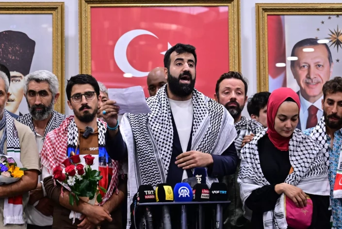 Küresel Sumud Filosu teknelerinde yer alan 15 Türk aktivist, THY uçağıyla geldikleri İstanbul Havalimanı'ndaki karşılamanın ardından basın mensuplarına açıklama yaptı.