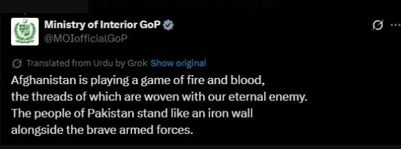 Pakistan İçişleri Bakanlığı: "Afganistan ateş ve kan oyunu oynuyor, iplikleri ebedi düşmanımızla örülü olan. Pakistan halkı demir bir duvar gibi duruyor cesur silahlı kuvvetlerin yanında."