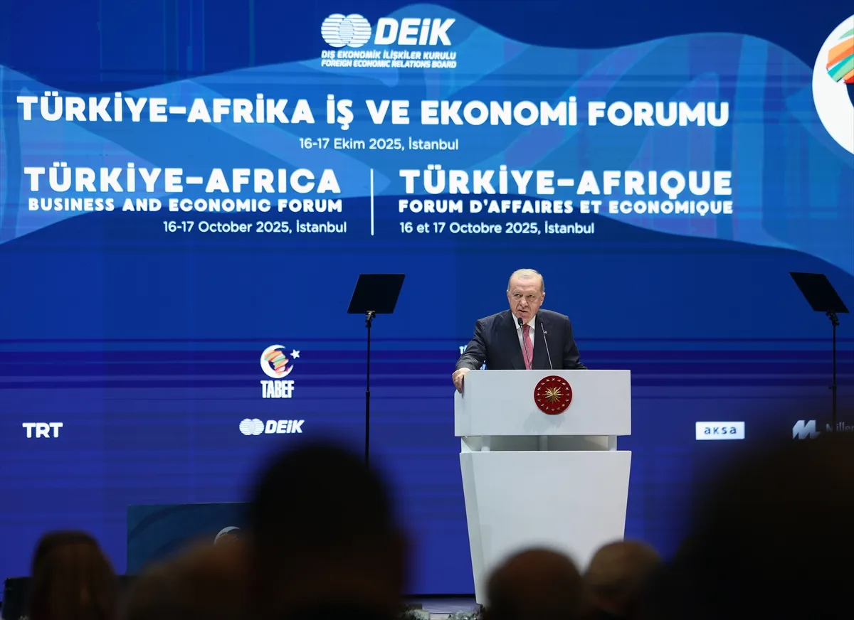 Afrika Birliği Komisyonu Başkanı Mahmud Ali Yusuf'a 2025 yılında üstlendiği komisyon başkanlığı görevinde başarılar dileyen Erdoğan, Türk iş insanları ve yatırımcılarını kıta genelinde gerek altyapı gerekse üst yapı noktasında sürdürdükleri çalışmalarından ötürü tebrik edip, forumun hayırlı olmasını diledi.Başkan Erdoğan, Ticaret Bakanlığı'nın ev sahipliğinde, Afrika Birliği koordinasyonunda ve DEİK organizasyonuyla İstanbul Kongre Merkezi'nde düzenlenen Türkiye-Afrika İş ve Ekonomi Forumu'na katıldı (Fotoğraf: AA)Başkan Erdoğan, Ticaret Bakanlığı'nın ev sahipliğinde, Afrika Birliği koordinasyonunda ve DEİK organizasyonuyla İstanbul Kongre Merkezi'nde düzenlenen Türkiye-Afrika İş ve Ekonomi Forumu'na katıldı (Fotoğraf: AA)