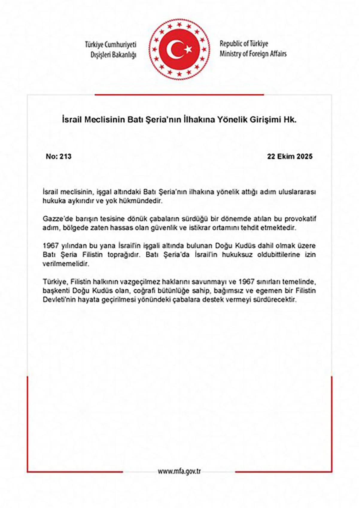 Bakanlık, İsrail’in Batı Şeria’yı ilhak etme girişimini ele alırken, “İsrail meclisinin, işgal altındaki Batı Şeria'nın ilhakına yönelik attığı adım uluslararası hukuka aykırıdır ve yok hükmündedir” ifadelerini kullandı. Açıklamada, 1967’den bu yana İsrail’in işgali altında bulunan Doğu Kudüs dâhil tüm Batı Şeria’nın Filistin toprağı olduğu hatırlatıldı.