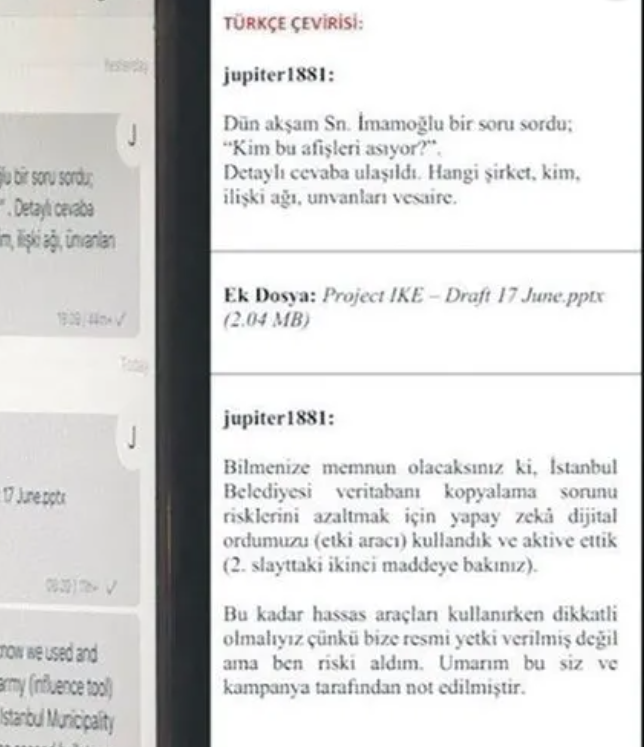 İngiliz istihbaratıyla bağlantılı Hüseyin Gün'ün, İmamoğlu'nun seçim kampanyasını yöneten Necati Özkan'a yolladığı en dikkat çeken mesajlardan biri "Dün akşam Sn. İmamoğlu bir soru sordu; 'Kim bu afişleri asıyor?' Detaylı cevaba ulaşıldı. Hangi şirket, kim, ilişki ağı, unvanları vesaire. Bilgiler şifreli dosya içerisinde" oldu.