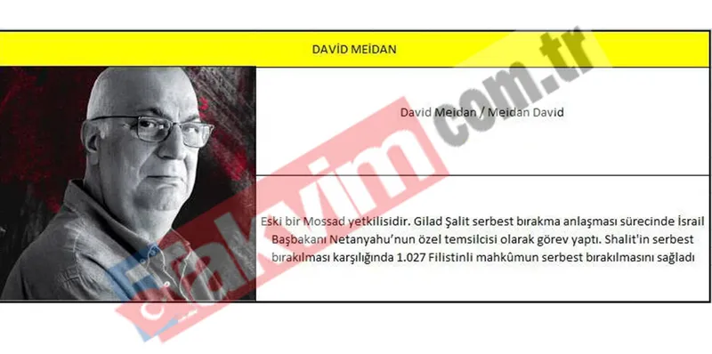 David Meidan / Meidan David: Eski bir Mossad yetkilisidir. Gilad Şalit'in serbest bırakma anlaşması sürecinde İsrail Başbakanı Netanyahu'nun özel temsilcisi olarak görev yaptı. Şalit'in serbest bırakılması karşılığında 1.027 Filistinli mahkûmun serbest bırakılmasını sağladı.