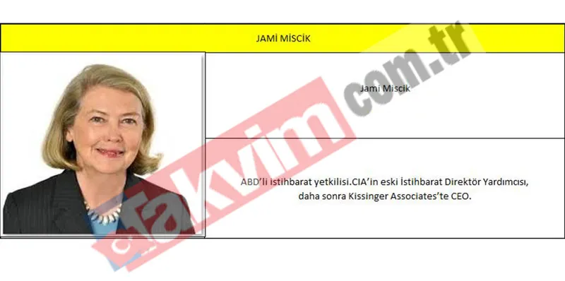 Jami Miscik: ABD'li istihbarat yetkilisi. CIA'in eski İstihbarat Direktör Yardımcısı, daha sonra Kissinger Associates'te CEO olarak görev yaptı.