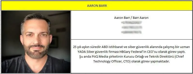 Savcılığın ön inceleme raporuna göre, Gün'ün cihazlarında 5 bin 697 kişilik rehber listesi tespit edildi. Listede yabancı istihbarat servisi çalışanları ve bürokratların yanı sıra İngiltere dış istihbarat servisi MI6 Başkanı Richard Moore'un da yer aldığı belirtildi. Rapora göre, Gün'ün kullandığı telefon hattı ile Richard Moore'un hattı arasında iletişim trafiği saptandı. Gün, Moore'u "İngiltere'nin Türkiye Büyükelçisi olduğu dönemden tanıdığını, sonrasında bir teması olmadığını" ifade etti. Cihazlarda ayrıca Aaron Barr'a ait "ADBARR CV.pdf" adlı belge bulundu. Belgede Barr, 33 yıllık istihbarat ve güvenlik geçmişine sahip, "tam otomatik sosyal medya dijital efekt platformu" geliştiren bir teknoloji direktörü olarak tanımlanıyordu.