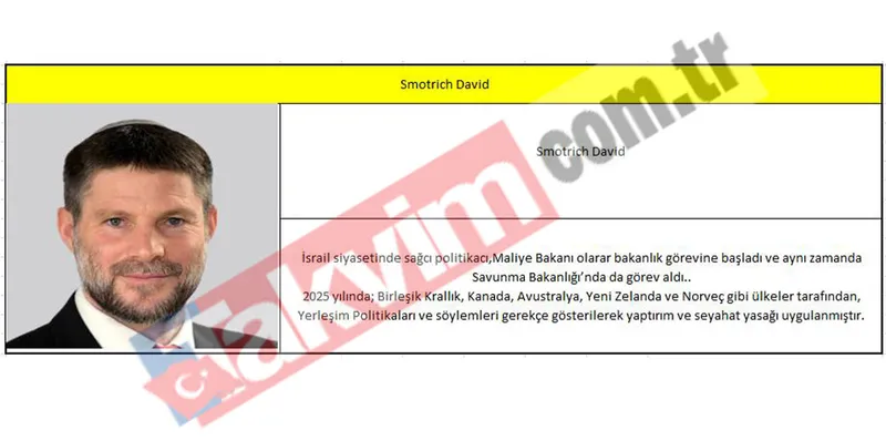 Smotrich David: İsrail siyasetinde sağcı politikacı. Maliye Bakanı olarak göreve başladı ve aynı zamanda Savunma Bakanlığı'nda da görev aldı.