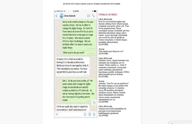 Soruşturma kayıtlarında, Aaron Barr'ın 2 Eylül 2019 tarihli mesajında "Necati Bey, gelecek hafta etkili bir demo yapabilmemiz için aşağıdaki soruların yanıtlarını bilmemiz gerekiyor" dediği görüldü. Mesajda "İBB'nin hangi alanlarıyla ilgileniyorsunuz, eğitim, mülteci meselesi, ulaşım mı?" ifadeleri yer aldı. Gün, bu mesajın "İBB sosyal yardım hizmetlerine dair planlanan sunumla" ilgili olduğunu söyledi. Ancak savcılık, yazışmada geçen "CoS (Chief of Staff)" yani "Özel Kalem Müdürü" ifadesi nedeniyle konunun sadece teknik bir sunumdan ibaret olmadığını değerlendirdi.
