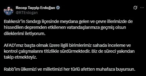 Erdoğan, "Balıkesir'in Sındırgı ilçesinde meydana gelen ve çevre illerimizde de hissedilen depremden etkilenen vatandaşlarımıza geçmiş olsun dileklerimi iletiyorum. AFAD'ımız başta olmak üzere ilgili birimlerimiz sahada inceleme ve kontrol çalışmalarını titizlikle sürdürmektedir. Biz de süreci yakından takip etmekteyiz. Rabb'im ülkemizi ve milletimizi her türlü afetten muhafaza buyursun." ifadelerini kullandı.