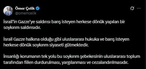 Çelik, sosyal medya hesabından yaptığı açıklamada, İsrail'in Gazze'ye saldırısının barış isteyen herkese dönük bir soykırım saldırısı olduğunu belirterek şunları kaydetti: