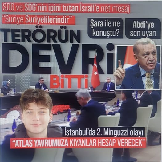 Cumhurbaşkanı Recep Tayyip Erdoğan, Kabine Toplantısı'nın ardından açıklamalarda bulundu. İran ve Suriye'de yaşanan gelişmeleri değerlendiren Erdoğan "Komşumuz İran, İsrail saldırılarının ardından şimdi de toplumsal olaylar üzerinden yeni bir sınavın içinde. İranlı kardeşlerimizin tuzaklarla dolu bu dönemi geride bırakacağına inanıyoruz. Suriye Suriyelilerindir. Suriyeli kardeşlerimizin yalnız bırakmadığımız gibi yarında bırakmayacağız. Görüşmemizde Şara'yı tebrik ettim. Suriye ordusu başarılı bir sınav verdi. Devlet için devlet olmaz. Bölgemizde terörün devri kapandı." dedi. Erdoğan katledilen Atlas Çağlayan için ise "Başta Adalet Bakanlığımız olmak üzerine tüm bunların üzerine gitmek suretiyle tüm gerekenleri yapmak bizim vazifemizdir. Minguzzi olayı neyse Atlas da odur." ifadelerini kullandı.