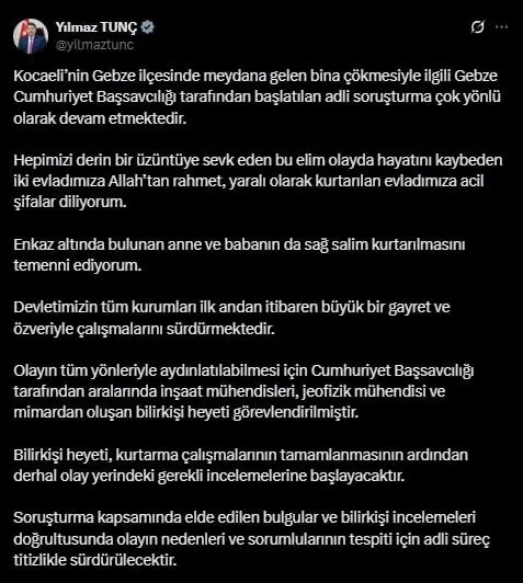 Kocaeli’nin Gebze ilçesinde meydana gelen bina çökmesiyle ilgili Gebze Cumhuriyet Başsavcılığı tarafından başlatılan adli soruşturma çok yönlü olarak devam etmektedir.Hepimizi derin bir üzüntüye sevk eden bu elim olayda hayatını kaybeden iki evladımıza Allah’tan rahmet, yaralı olarak kurtarılan evladımıza acil şifalar diliyorum.Enkaz altında bulunan anne ve babanın da sağ salim kurtarılmasını temenni ediyorum.Devletimizin tüm kurumları ilk andan itibaren büyük bir gayret ve özveriyle çalışmalarını sürdürmektedir.